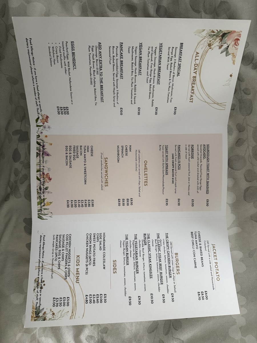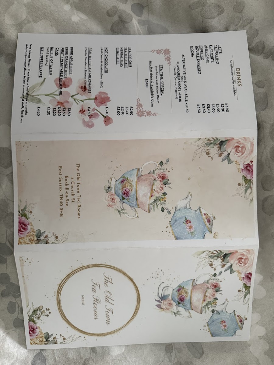 The menu at The Old Town Tea Room on Church St, Bexhill-on-Sea, offers a charming mix of classic comfort foods and light bites, perfect for a casual visit. For a hearty yet simple choice, the Jacket Potato options, including Cheese & Baked Beans and Tuna Mayo, or a warming Porridge, are ideal. Omelette lovers can enjoy varieties such as The Classic Steak, Beef Burger, or Vegetarian and Vegan Burgers, while the Crispy Chicken Burger and other burger selections provide satisfying indulgence. Lighter fare includes Homemade Coleslaw, Side Salad, Chips, Cheese, and Sweet Potato Fries, catering to those seeking a small but flavorful meal. Families are well accommodated with the Kids Menu, featuring Chicken Nuggets & Chips, Cod Fillet Fingers & Chips, Sausage & Chips, and Pancakes, ensuring little ones are happily catered for. The drink selection ranges from expertly prepared Latte, Cappuccino, Flat White, and Americano to a rich Espresso, complementing both sweet and savory dishes. Additionally, traditional options like Toast With Spreads, Sausage, Egg & Chips, and a variety of teas-including Tea For One, Tea To Share, and Herbal Teas-round out the menu, providing something for every taste. Overall, the menu blends classic British comfort with approachable choices, making it a welcoming spot for both locals and visitors.